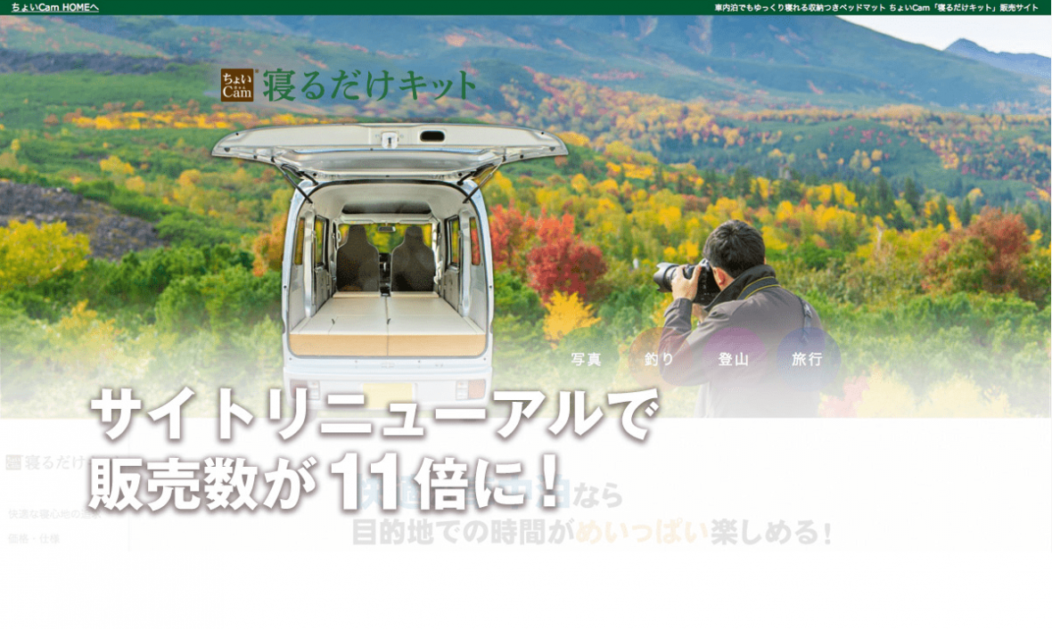 すると、写真、釣り、登山、旅行など、趣味のために購入するお客さんが大部分を占めていたため、実際に軽キャンピングカーちょいCamを使った時のイメージが湧きやすい写真をメインで大きく紹介しました。