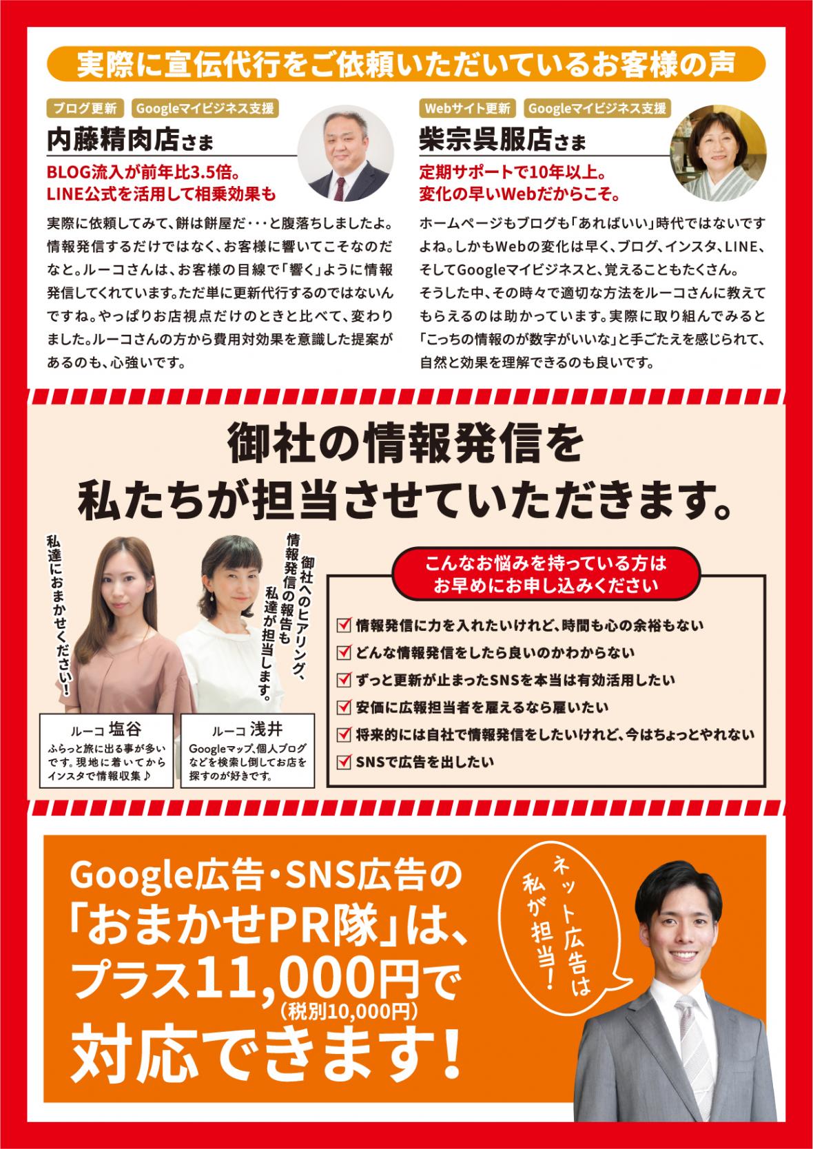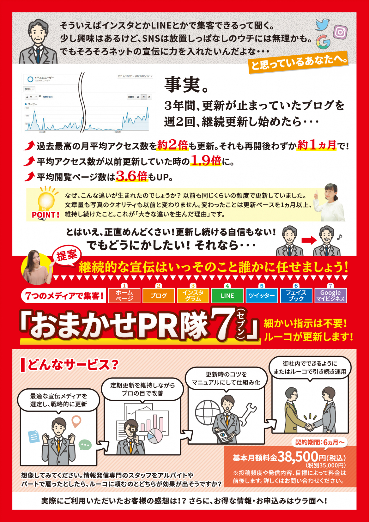 「おまかせPR隊7」では、HP、ブログ、インスタグラム、LINE、ツイッター、フェイスブック、Googleマイビジネスの7つのメディア運用を代行しながら、企業様に合わせた掲載内容を提案したり、強みを発見するといったコンサルも提供しています。