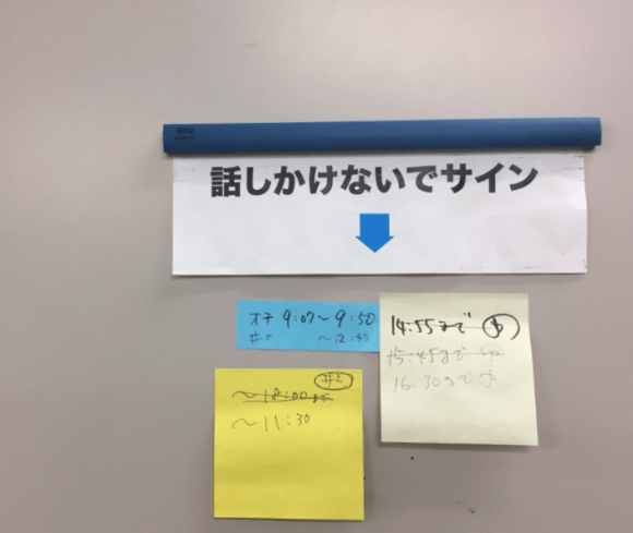 - 宣言したうえで、集中タイム時間を記載した付箋を社内中央のキャビネットに貼る。